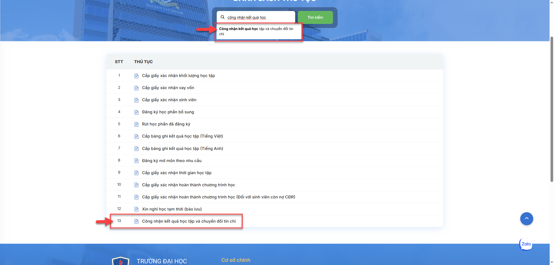 Bước 2: - Tìm kiếm từ khóa "Công nhận kết quả học tập và chuyển đổi tín chỉ" hoặc chọn trực tiếp loại đơn học vụ. |