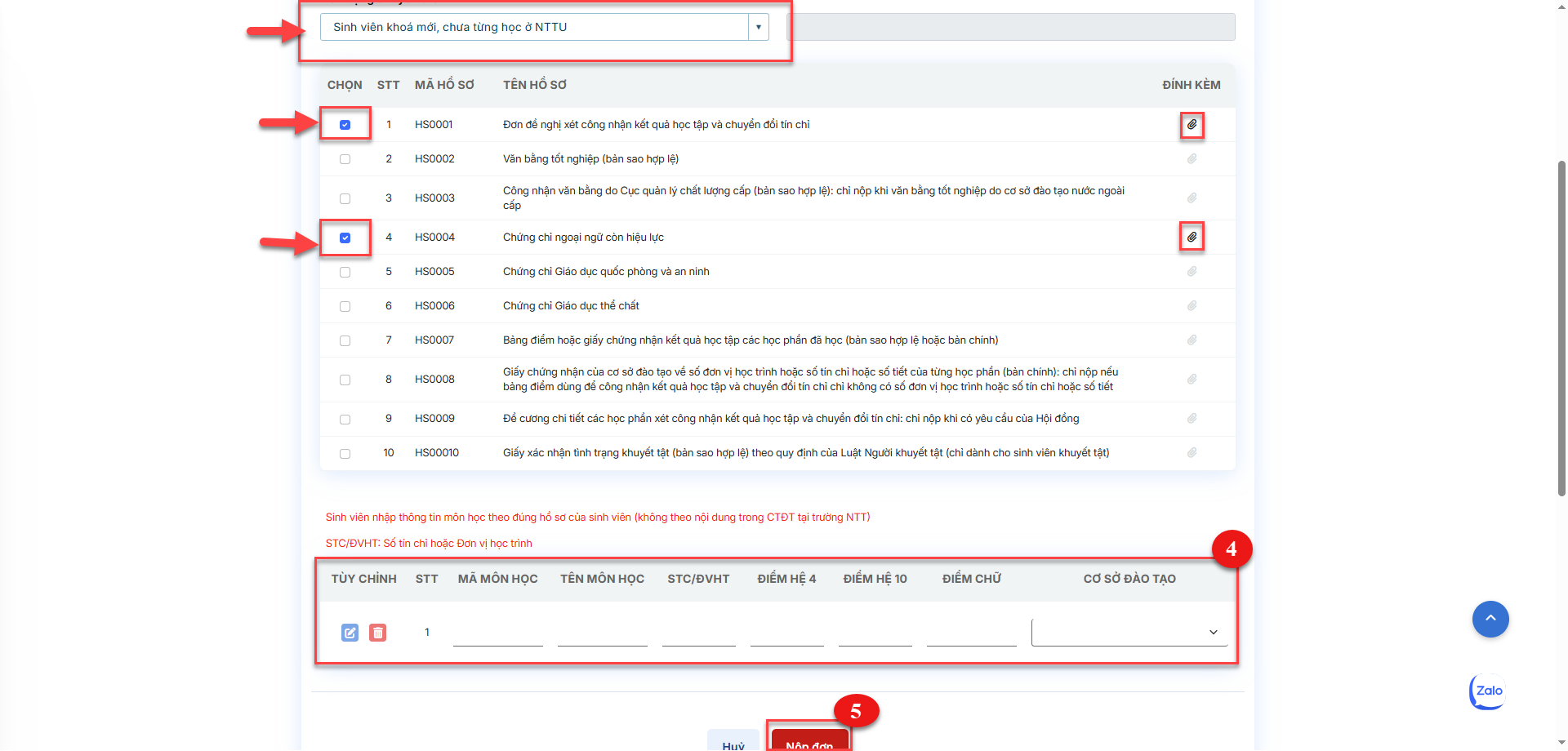 Bước 4: - Người học thực hiện khai báo các thông tin của đơn công nhận chuyển điểm theo yêu cầu + Đối tượng chuyển điểm: Người học chọn thông tin đối tượng chuyển điểm theo danh mục đúng với trường hợp của người học + Trong danh sách hồ sơ đính kèm